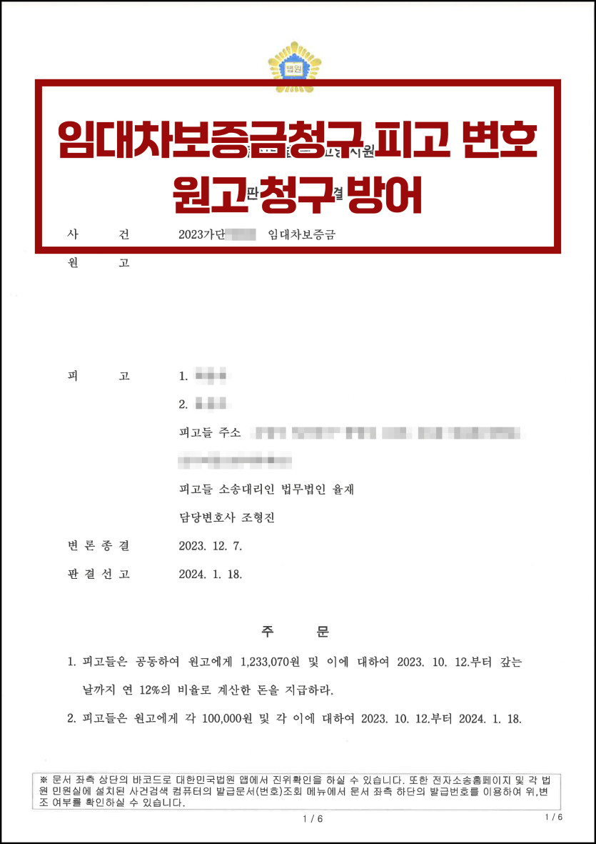 본 사건은 대개 상대적 약자 입장이 되는 임차인 변호가 아닌, 임대인 측을 변호하여 임차인의 무리한 요구를 방어한 사례입니다.