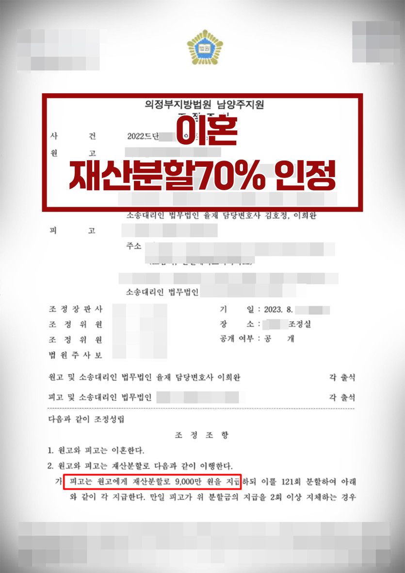 2. 혼인 파탄 원인이 전적으로 배우자에게 있다는 점을 적극 활용하여 조정위원회로부터 위자료에 상응하는 재산분할액수 인정