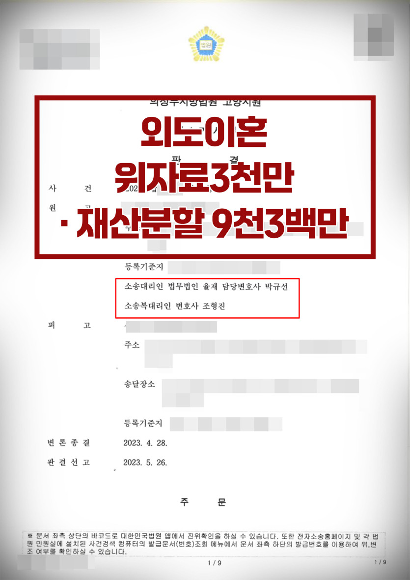 [이혼·위자료·재산분할]위자료 3천만원ㅣ재산분할 9천2백만원