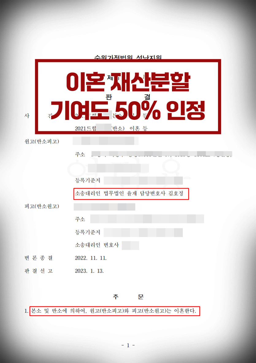 의뢰인은 재산분할 기여도 50%를 인정받았습니다.