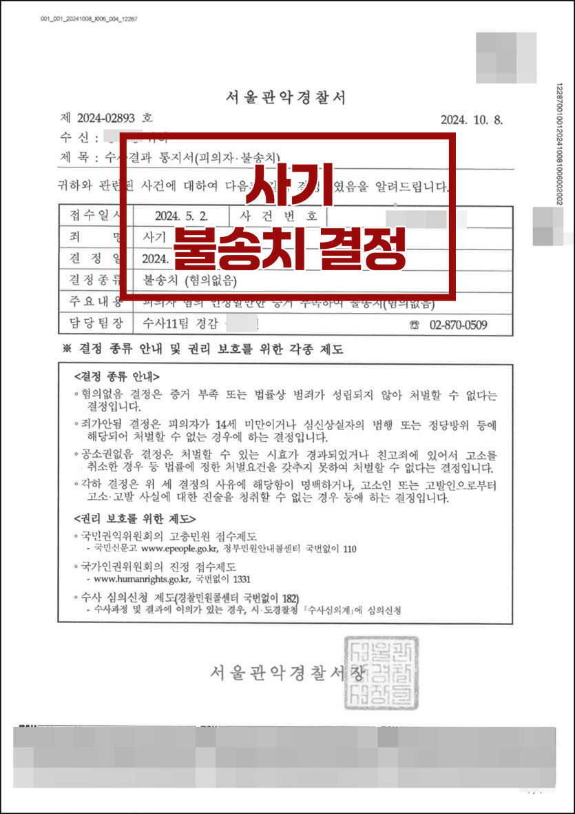[사기] 경찰 단계 '불송치결정'으로 방어한 사례
