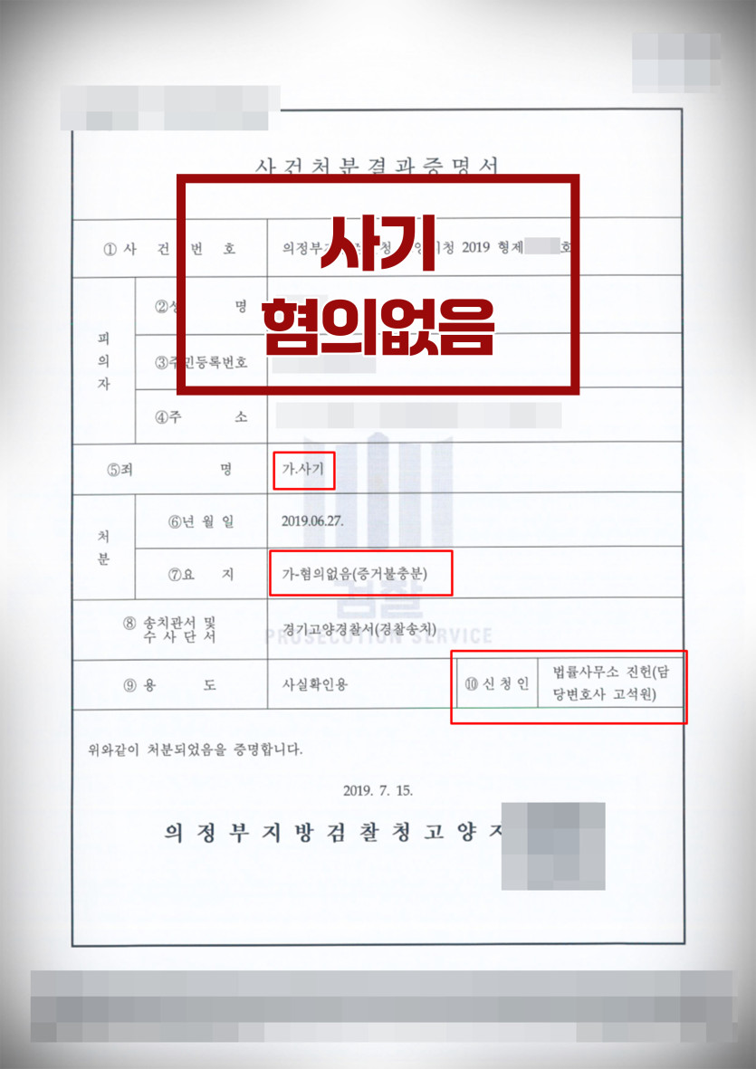 [사기] 검찰 단계 혐의없음으로 방어한 사례