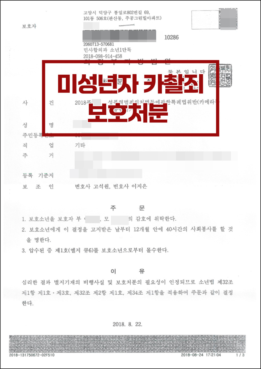 [미성년자 성범죄] 카촬죄 보호처분 1호 및 3호로 방어한 사례
