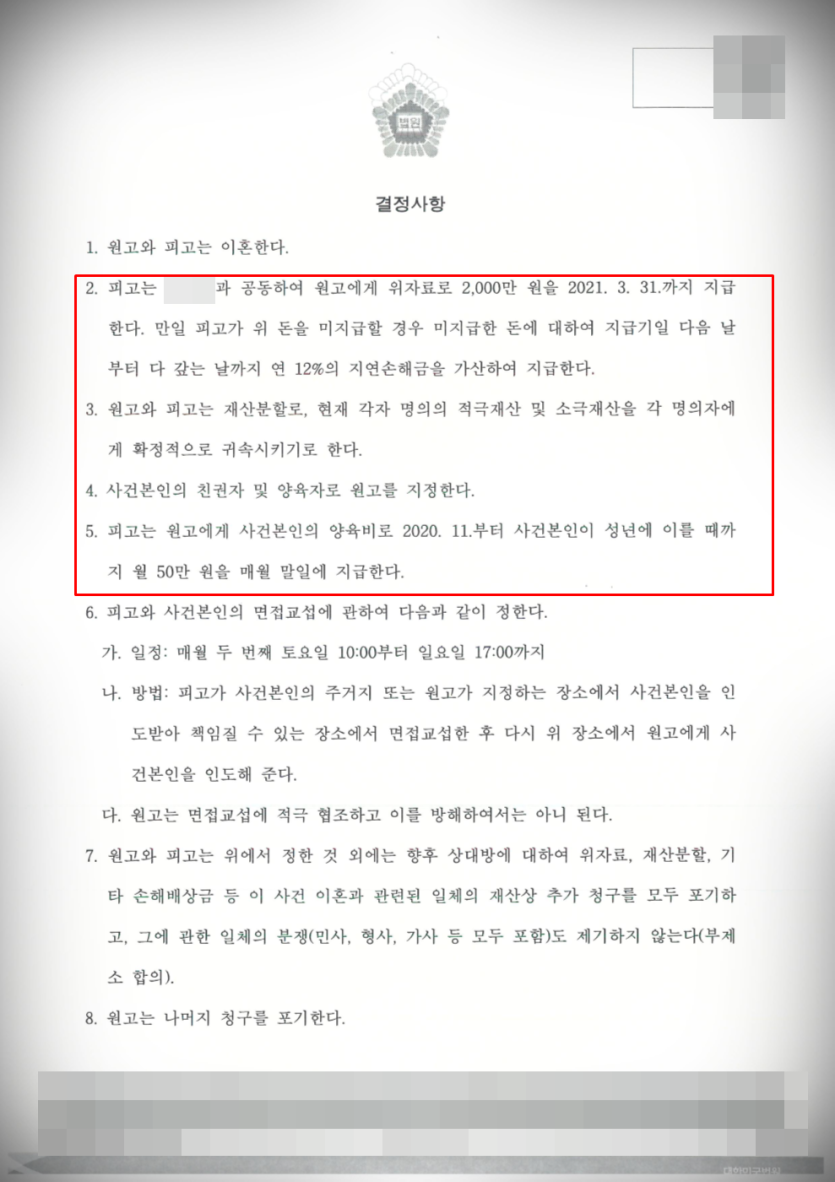 위자료 2천만 원, 양육권 및 자녀 양육비 50만 원 지급 결정