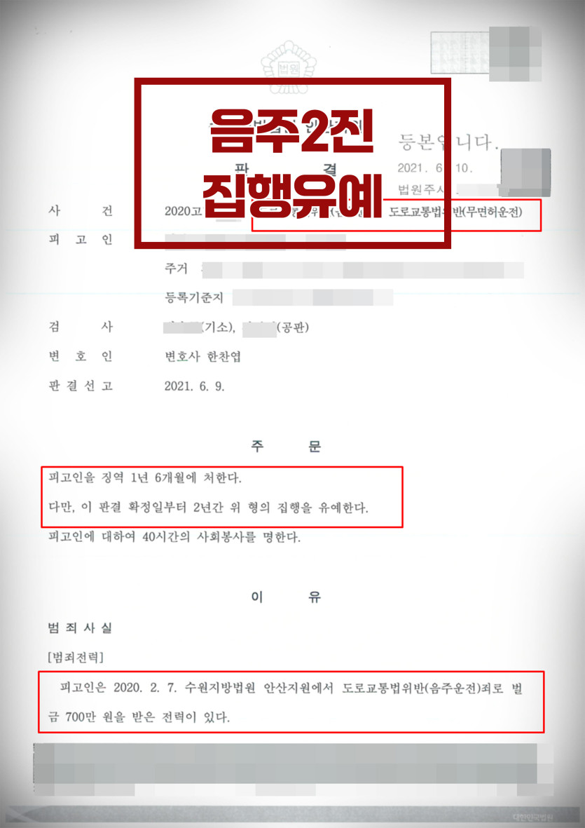 [음주운전 2진아웃] 집행유예로 방어한 사례