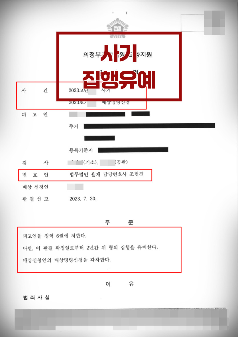 본 사건의 피고인 변호를 맡은 저희 율재로서는 의뢰인을 보호하고 재판부의 선처를 최대한 이끌어내기 위한 전략을 토대로 만족스러운 결과를 도출할 수 있었습니다.