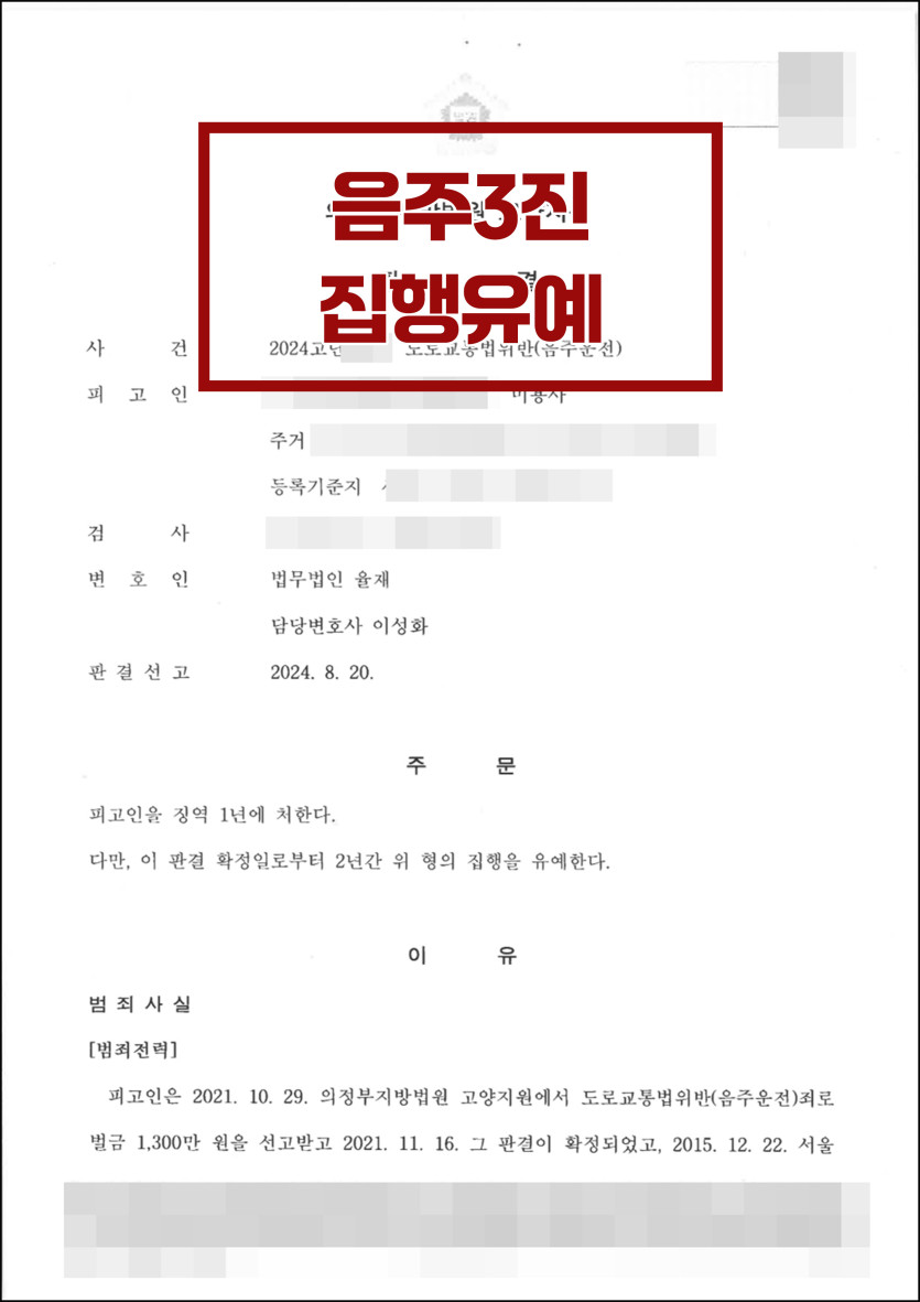 특히 음주운전 3진아웃인 상황이었기에 무거운 처벌이 예상되는 사건이었는데요. 저희 율재 소속 변호사들은 회의를 통해 집행유예를 목표로 사건 대응을 준비하였습니다.