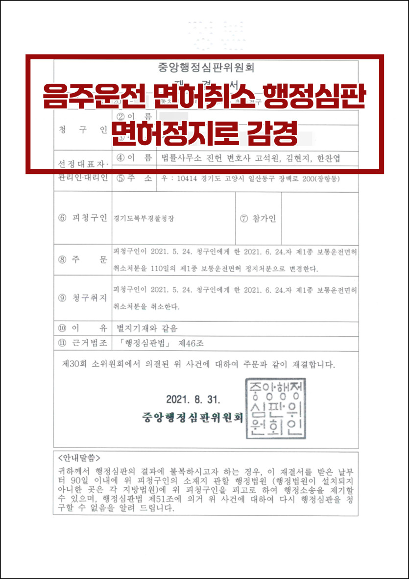 [음주운전 면허취소 행정심판 청구] 면허정지로 변경한 사례