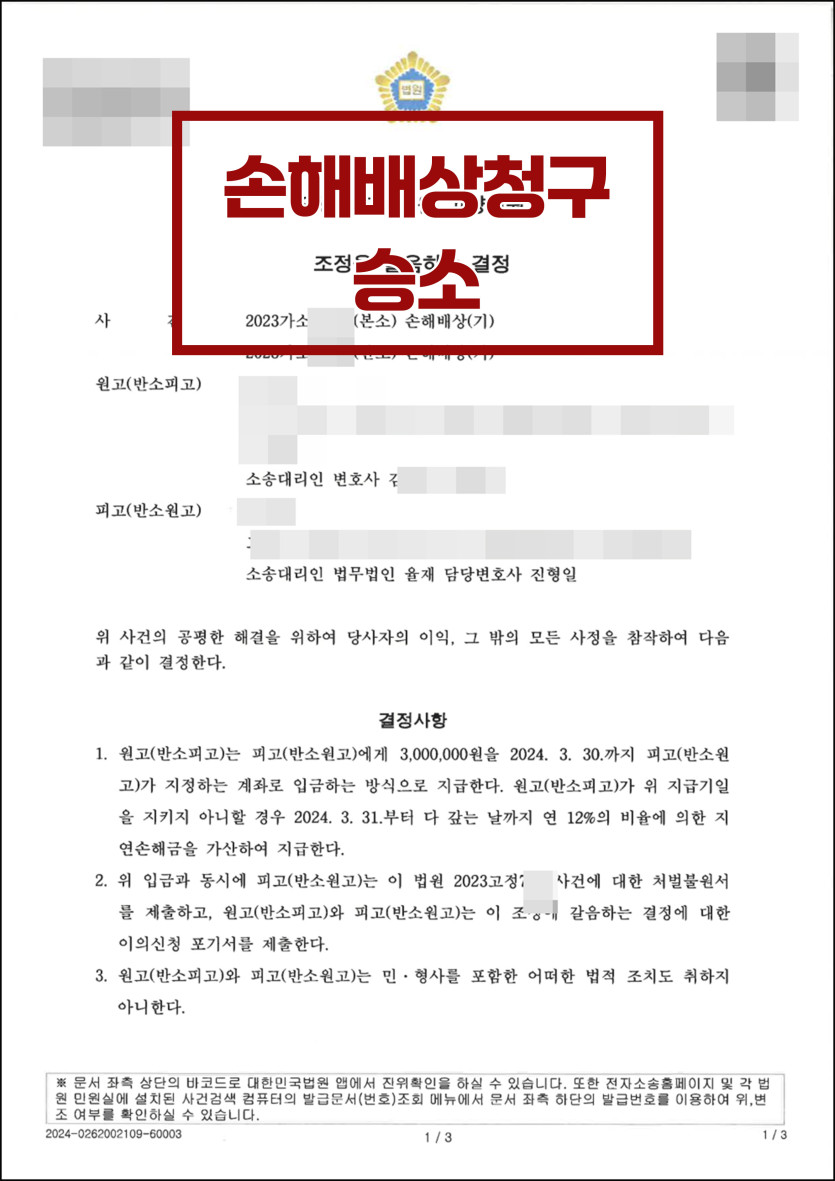 원고가 의뢰인에게 3백만원의 손해배상금을 지급하라는 인용을 받았습니다.