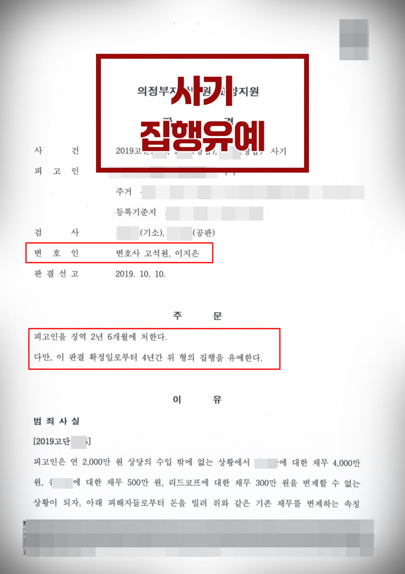2. 사기 액수가 매우 큰 사건(약 2억7천만원)이기에 무거운 처벌이 예상되었지만 담당 변호사와 배우자의 노력으로 피해액 상당수를 복구
