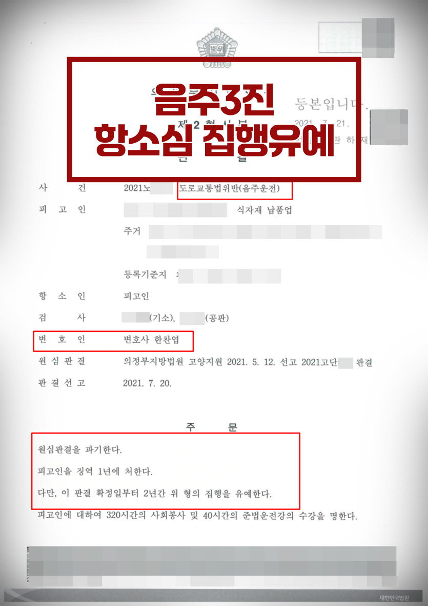 [음주운전 3진아웃]1심 실형에서 2심 집행유예로 방어한 사례