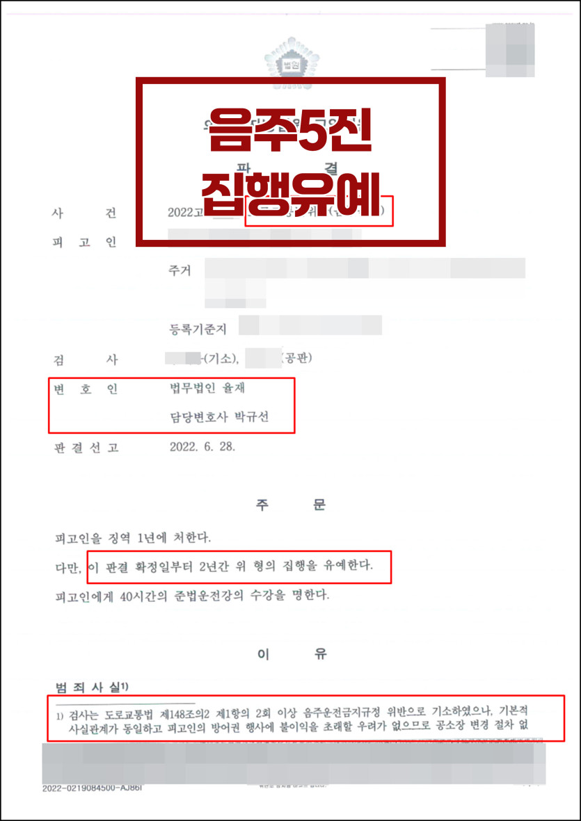 [음주운전 5진아웃] 집행유예로 방어한 사례