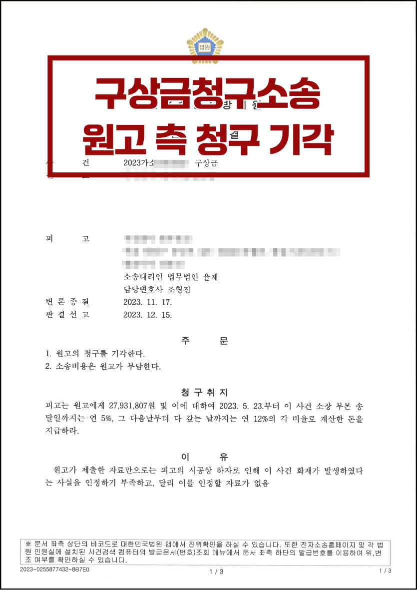 만약 원고인 보험회사 측 주장이 사실이었다면 의뢰인은 막대한 구상금을 원고에게 지급해야 하는 상황이었는데요. 다행히 저희 율재의 증거 수집과 관계인 및 관련 전문가와의 접촉으로 원고 측 주장을 배척할 수 있었습니다.