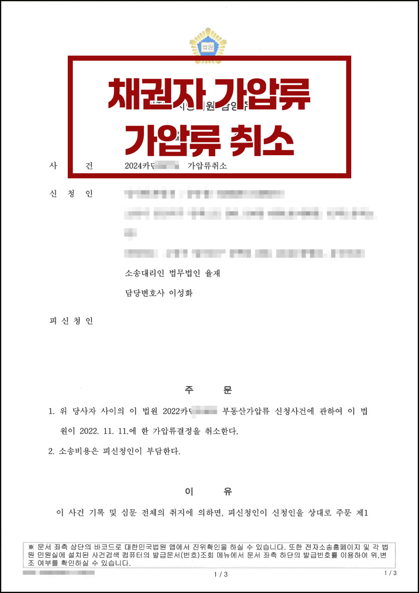 본 사건은 저희 율재를 통해 대여금소송 피고 입장에서 원고(피신청인)의 청구를 기각하여 승소한 의뢰인(신청인)께서 해당 대여금소송 원고가 의뢰인 소유 부동산에 행한 가압류를 취소하기 위한 절차입니다.