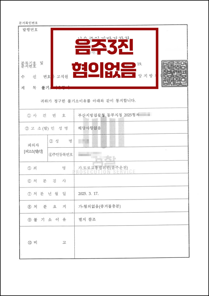 이례적으로 전과 4범 음주3진 사건임에도 정식 기소 없이 '혐의없음'으로 방어할 수 있었습니다.