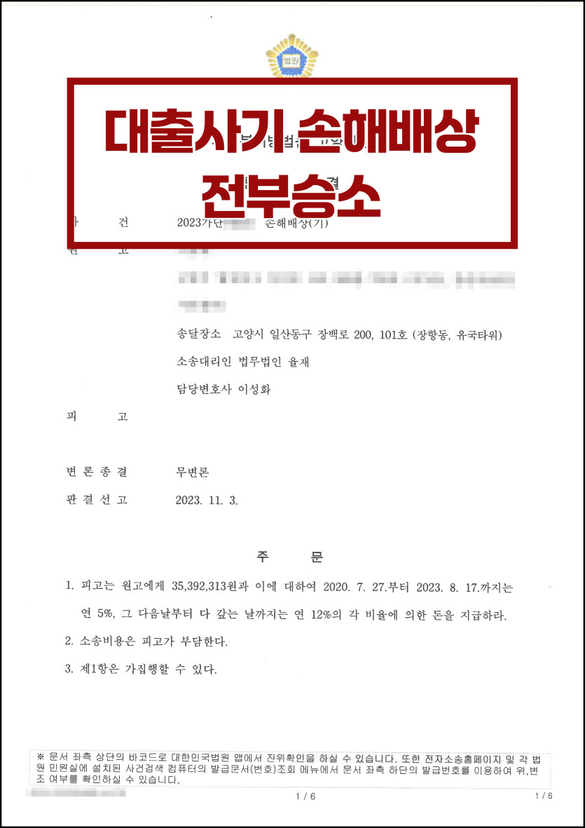 [대출사기 손해배상 청구] 전부승소로 해결한 사례