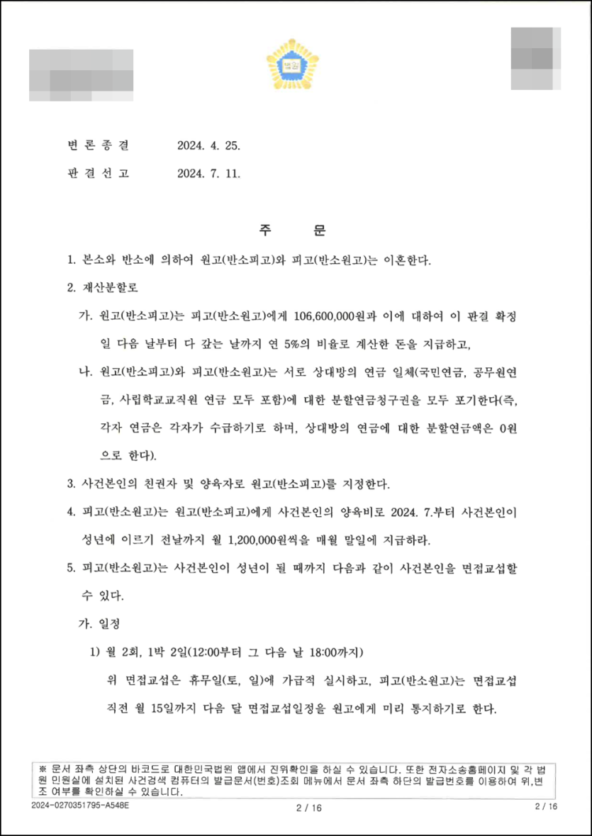 이혼 성립, 재산분할 1억6백6십만원, 양육비 120만원 조정으로 일부 승소하였습니다.