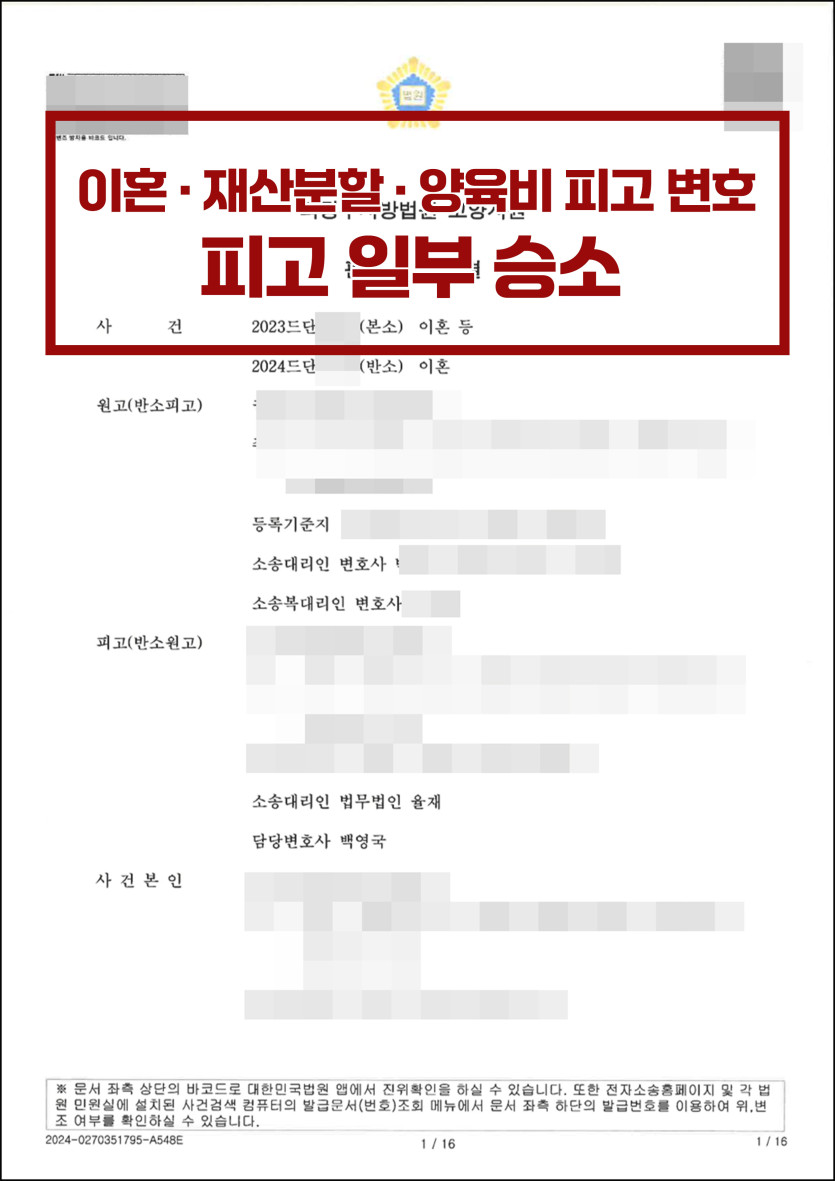 [이혼·재산분할·양육비 피고 변호] 일부 승소로 마무리한 사례