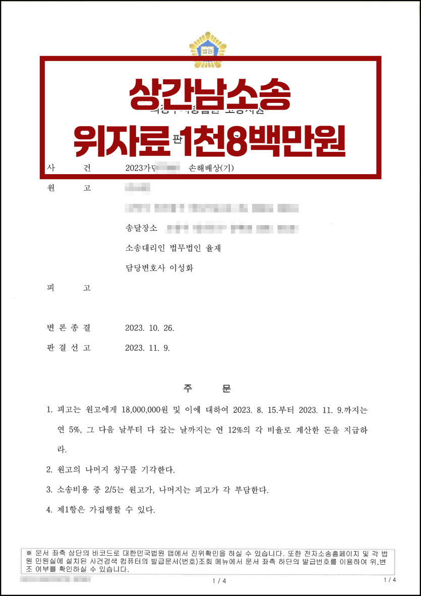 [상간남소송] 위자료 1천8백만원 인정 사례