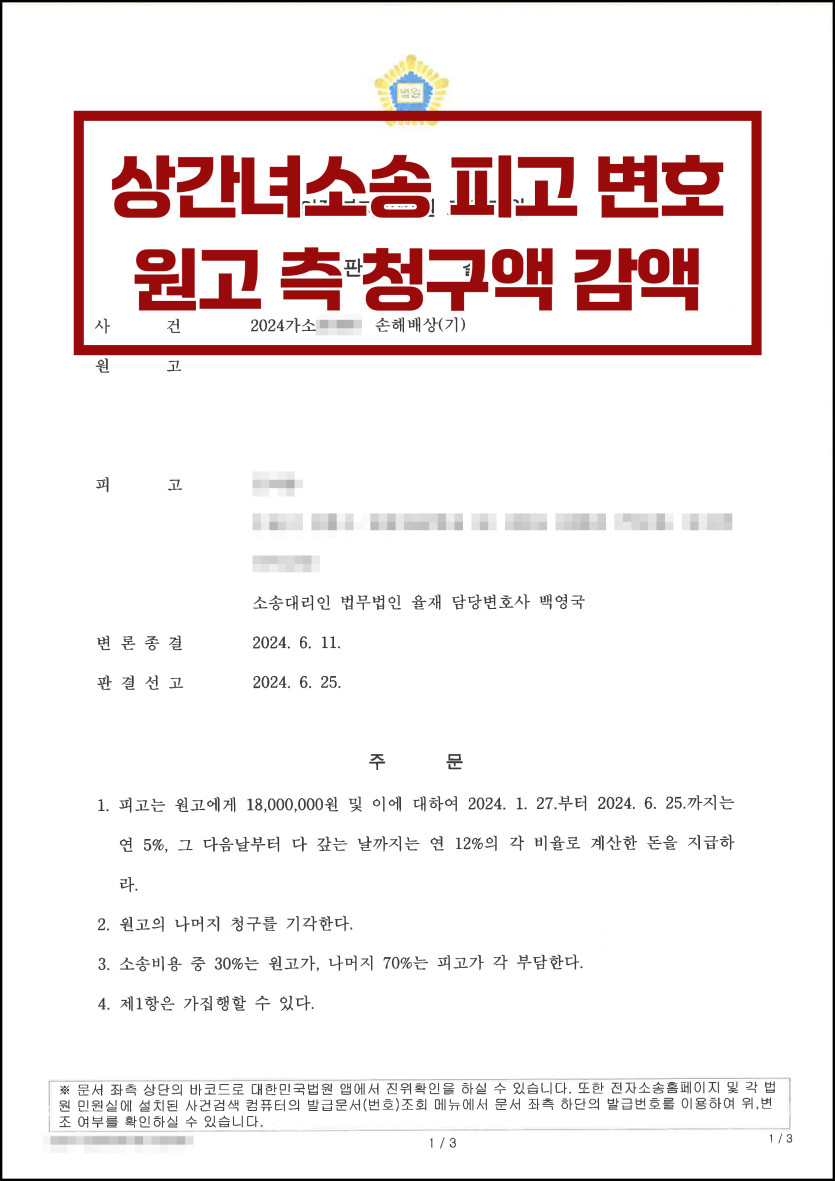 위자료 1천8천만원으로 원고 측 청구액을 감액하였습니다.