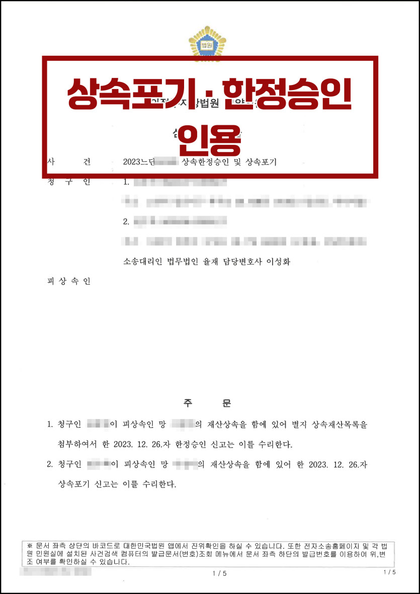 [상속 한정승인·상속포기 심판 청구] 배우자와 모친 한정승인 및 상속포기 인정 사례