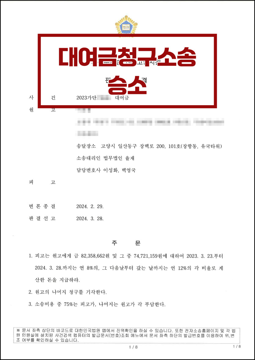 피고에게 대여금82,358,662원을 변제하라는 판결로 승소하였습니다.