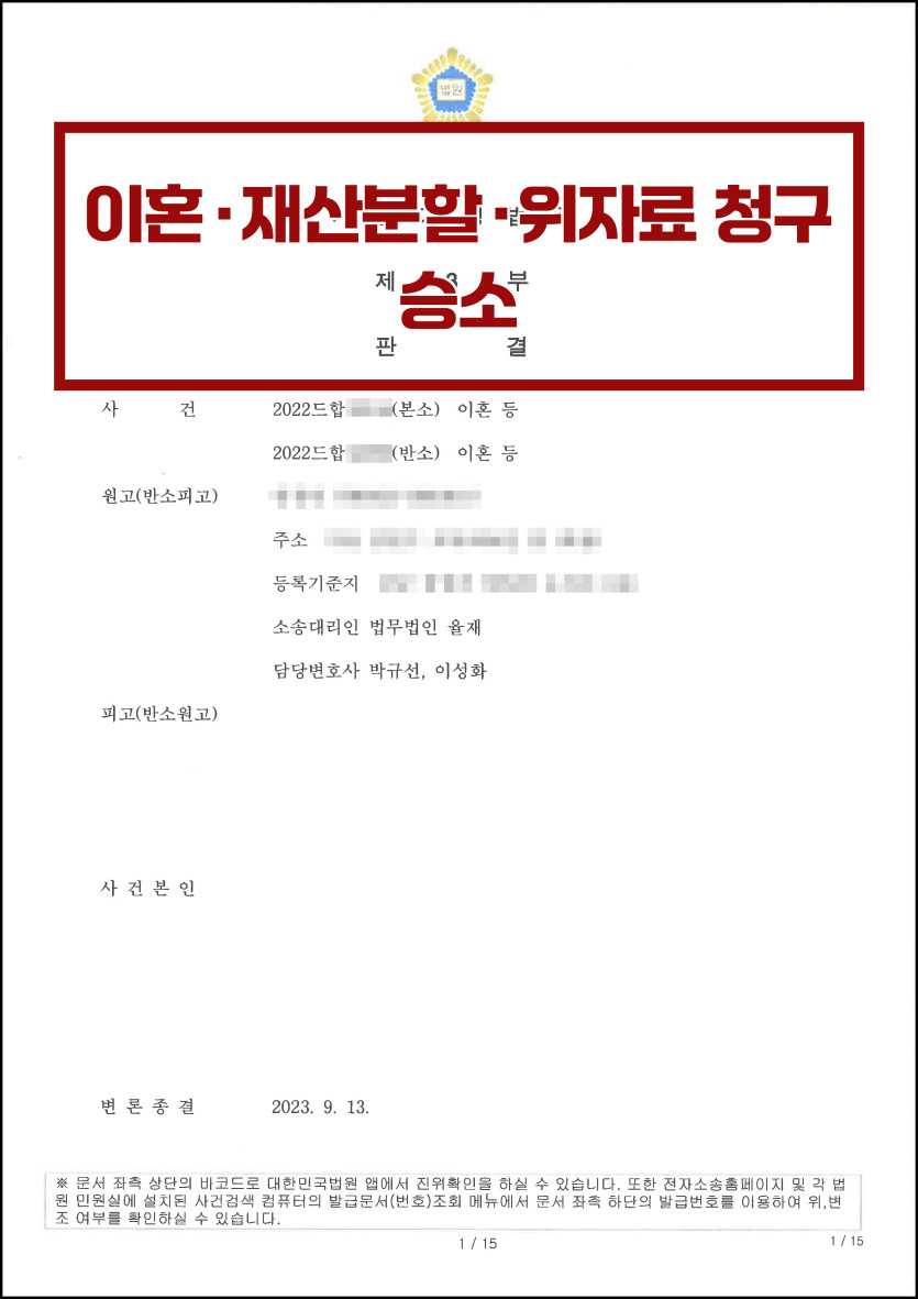 [이혼·재산분할·위자료 청구] 혼인파탄 이혼 청구 승소 사례