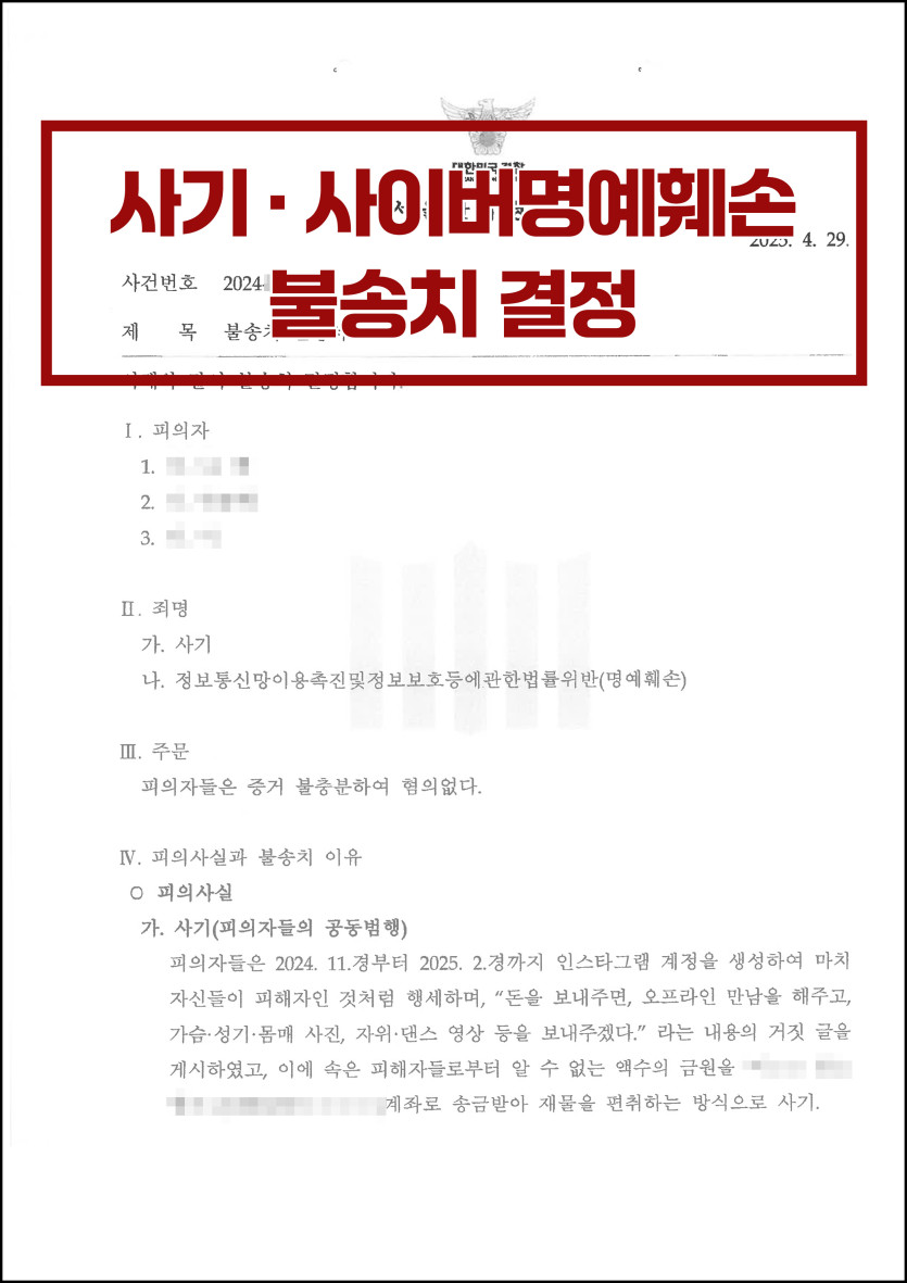 [사기·사이버명예훼손] 피해자 사칭 음란물 판매 및 정보통신망법위반 '불송치 결정' 사례