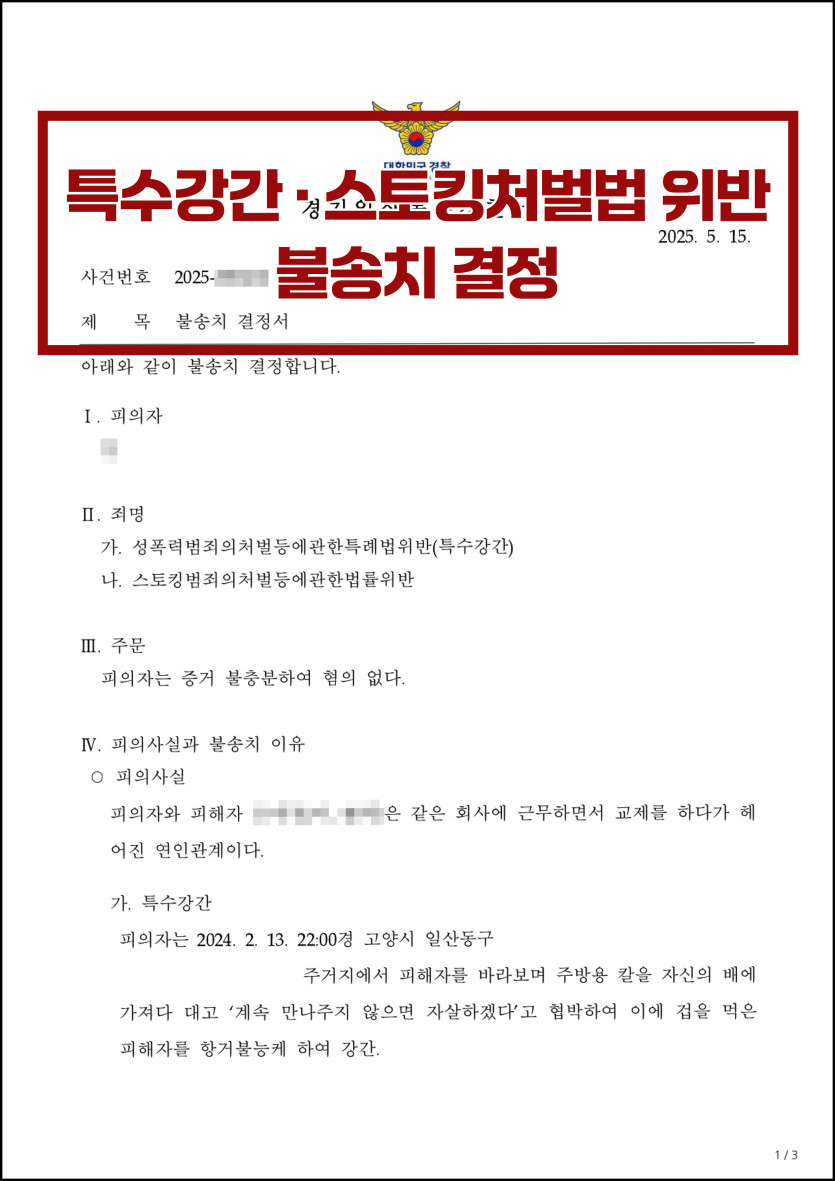 [특수강간·스토킹처벌법위반] 전 연인 상대 성범죄 등 '불송치 결정' 사례
