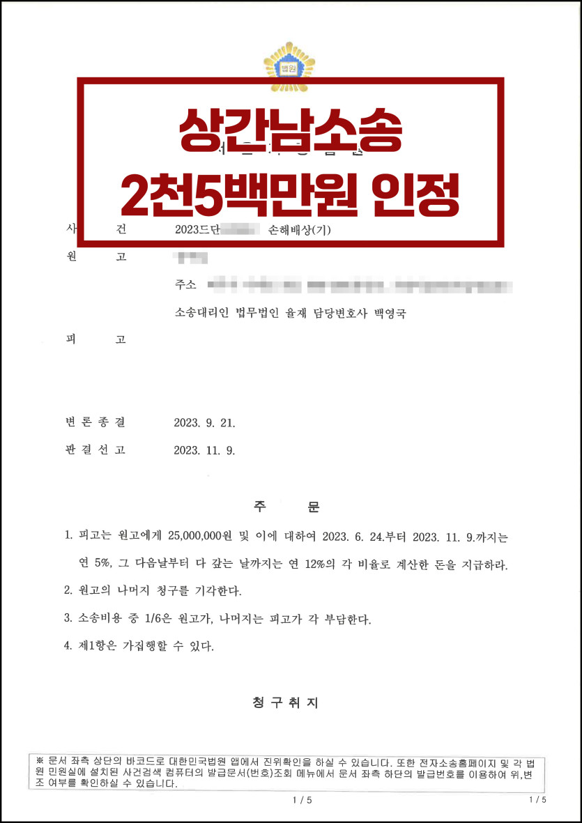 본 사건은 통상적으로 상간남소송에서 인정되는 위자료 액수(1천5백~2천5백만원)에서 만족스러운 결과로 마무리한 사례입니다.