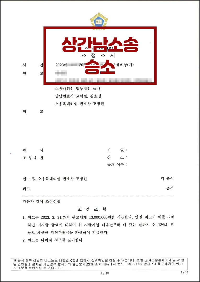 위자료 1천3백만원이 인정되어 승소하였습니다.