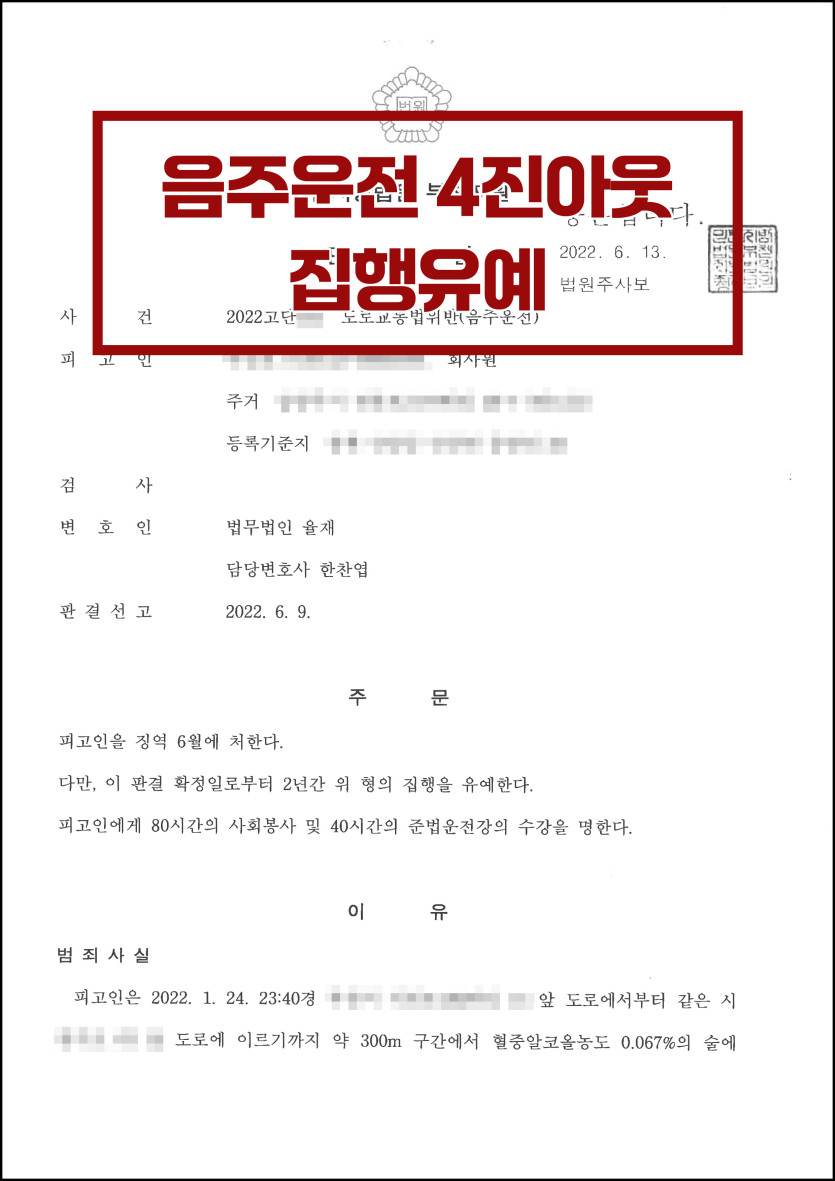 [음주4진] 음주운전 4진아웃 집행유예 방어 사례
